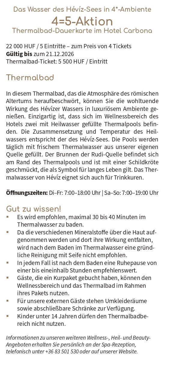 Wir arbeiten mit mehreren Reisebüros in Hévíz zusammen. Wir gewähren unseren Gästen 10 % Rabatt auf den Preis für Reisen nach Budapest, Wien und zum Plattensee. Verfügbar in Deutsch und Russisch.