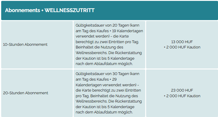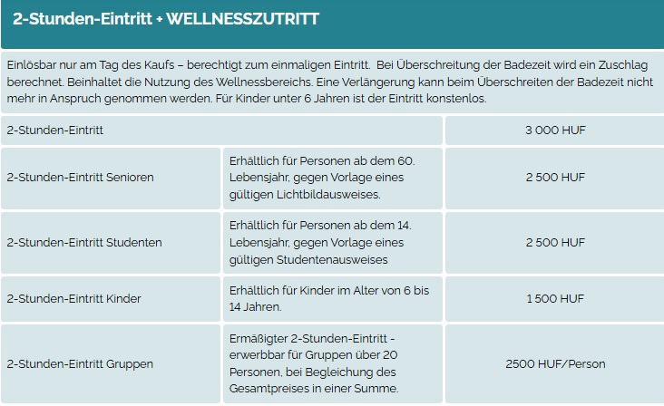 Am selben Hotel kann die Wellnessabteilung, je nach Auslastung des Hotels zum Preis von 4.000 Ft/Person (ab 16:00 Uhr) genutzt werden. Ganztags Wellness Benutzung ist 6000 Ft/Person. Vereinbarung an der Rezeption ist nötig.