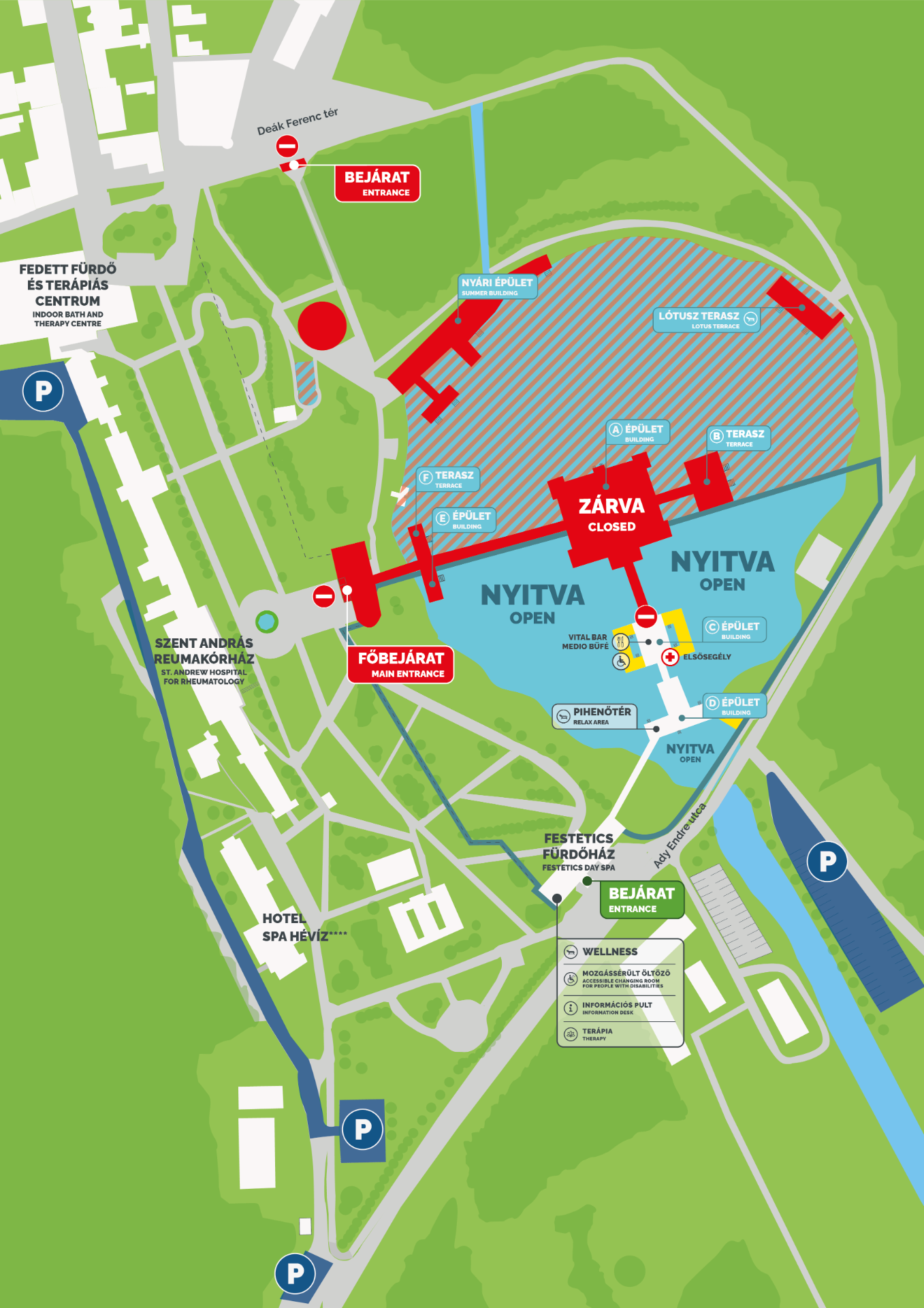 Während dieses Zeitraums ist der Thermalsee ausschließlich über den Eingang in der Ady-Straße durch das Festetics Badehaus zugänglich. Das zentrale Badehaus ("Gebäude A" und "Terrasse B") bleibt weiterhin geschlossen. Aufgrund technischer Vorbereitungsarbeiten sind abschnittsweise Sperrungen der Wasserfläche und des Uferbereichs zu erwarten. Der nördliche Teil der Wasserfläche – zwischen dem "Gebäude A" und dem Sommergebäude – wird ebenfalls gesperrt (siehe beiliegende Karte).