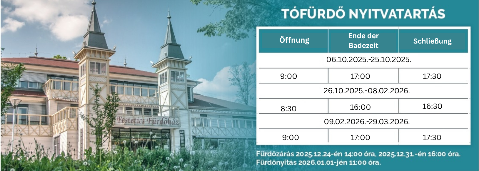 Ab dem 3. November 2025 wird der Haupteingang des Hévízer Thermalsees an der Dr.-Schulhof-Vilmos-Promenade geschlossen. Das Baden ist ausschließlich im Freien möglich. Zwischen dem 26. Oktober 2025 und dem 8. Februar 2026 gelten aufgrund der frühen Dunkelheit geänderte Öffnungszeiten.