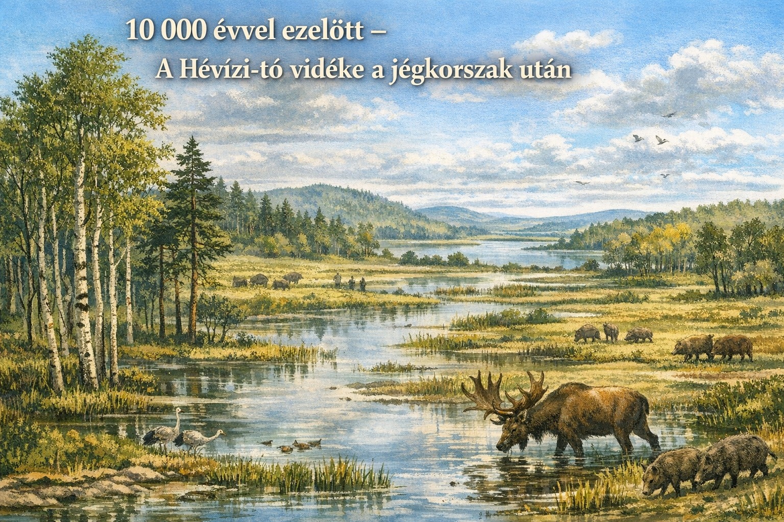 - A kép illusztratív tájrekonstrukció a jégkorszakot követő időszakról, a Hévízi-tó környezetére jellemző paleobotanikai folyamatok alapján. A kép mesterséges intelligencia segítségével készült.